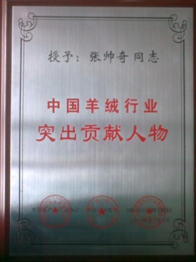 由中国畜产品流通协会与中国纺织报联合举办的“中国羊绒羊毛行业表彰先进系列活动”于2010年11月6日上午在北京人民大会堂举行隆重的颁奖仪式。圣雪海羊绒公司总经理张帅奇荣获中国羊绒行业“突出贡献人物奖”。