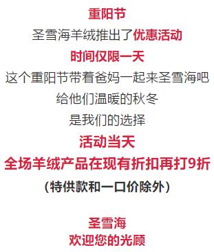 重阳节特惠!圣雪海浓浓敬老情,羊绒折上折!!!